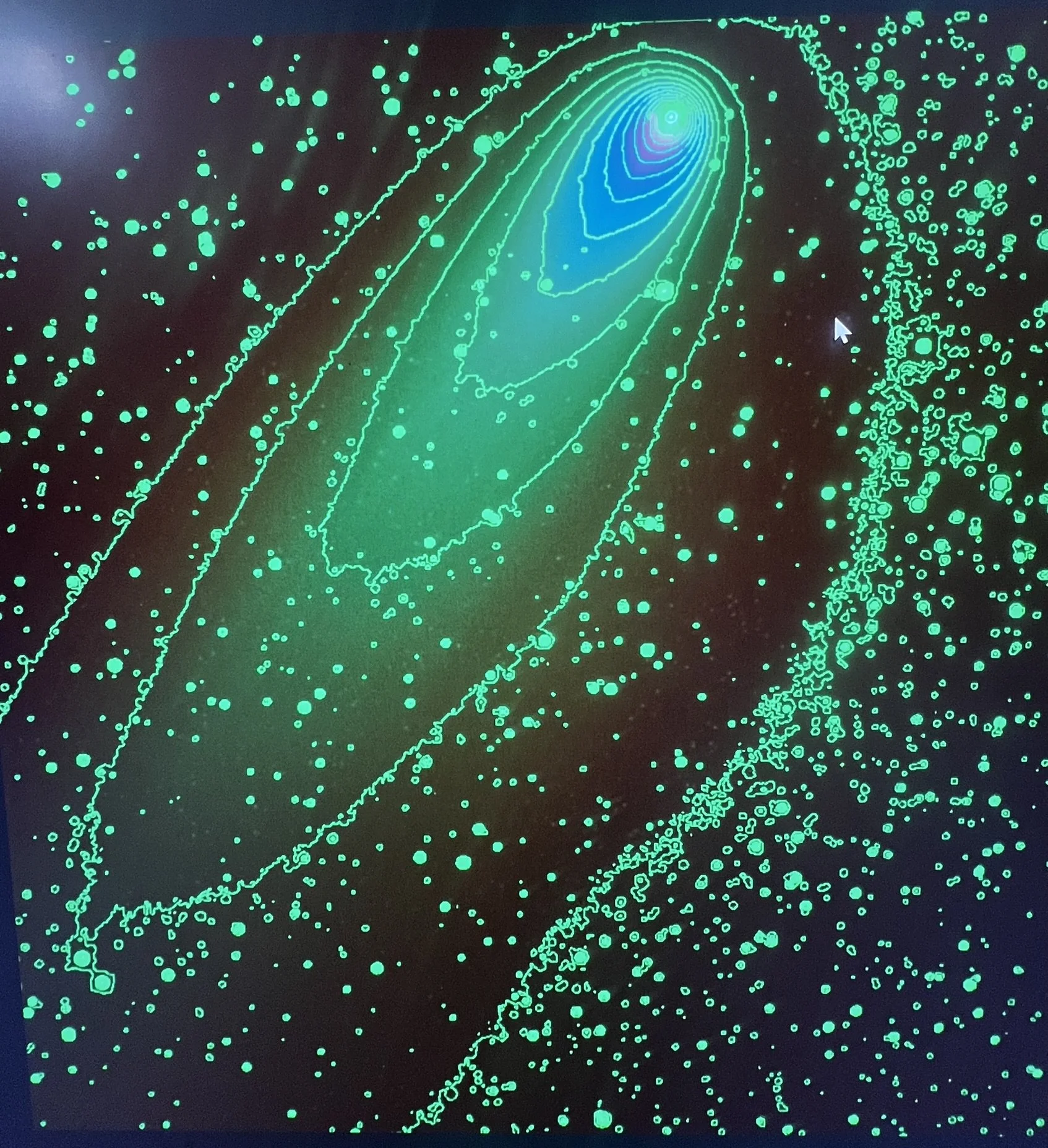 Credit to FRO visitor Bruce Wendorf for OUTSTANDING image capture and Enhancement using his camera phone to capture the image on the big screen and processing it to show the details!! Well Done, Bruce Note the Bow Shock where the solar wind is abruptly slowed, compressed, and heated. The Coma is dominated by sublimated CO, CO2, H2O the combination giving this comet a green glow. Next the Ionopause, the nucleus, the Inner Cavity or Dark Zone, then dust and ion tail.