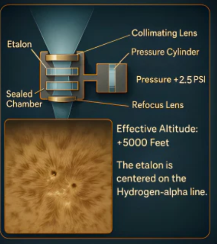 The specialized Lundt H-alpha solar refractor yields detailed images of the Sun’s surface and dramatic solar prominences through a single-stack Etalon filter at 656.28nm at <.65 Å bandpass with Doppler True Tuning (pressure-tuned) system.